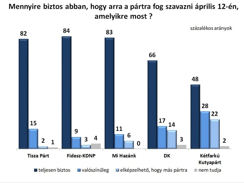A felmérés kitért a szavazói elkötelezettségre is. A Tisza, a Fidesz és a Mi Hazánk támogatói körében magas a stabilitás: 82, 84, illetve 83 százalék mondta azt, hogy biztosan az adott pártra szavazna. A Demokratikus Koalíciónál ez az arány 66 százalék, míg a Kutyapártnál 48 százalék.