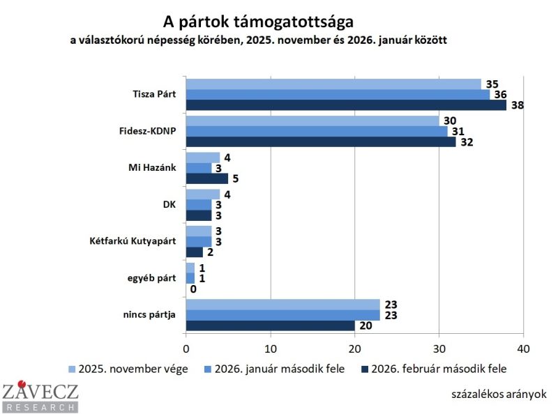 A teljes népességet vizsgálva szintén a Tisza vezet: jelenleg 38–32 arányban előzi meg a Fideszt. Januárban ez az arány még 36–31 volt. Mindkét politikai erő növelni tudta táborát, miközben a bizonytalanok aránya 23 százalékról 20 százalékra csökkent.